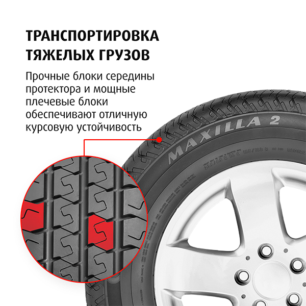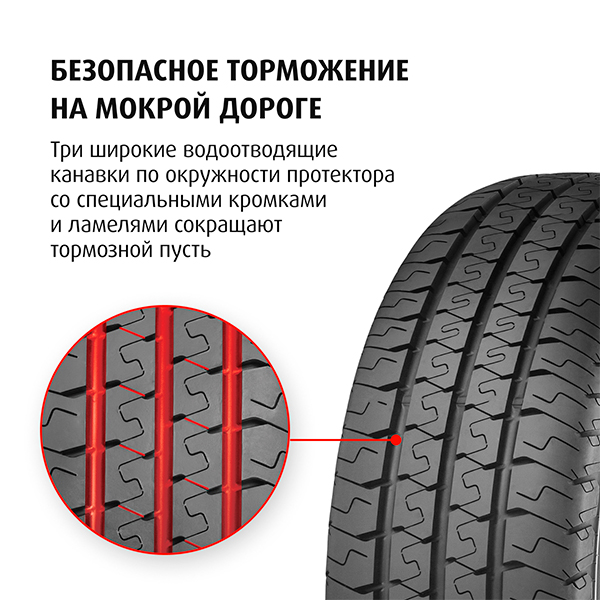 - Твёрдость блоков протектора и их плотное расположение: Высокая курсовая устойчивость при движении легко-грузовых автомобилей.